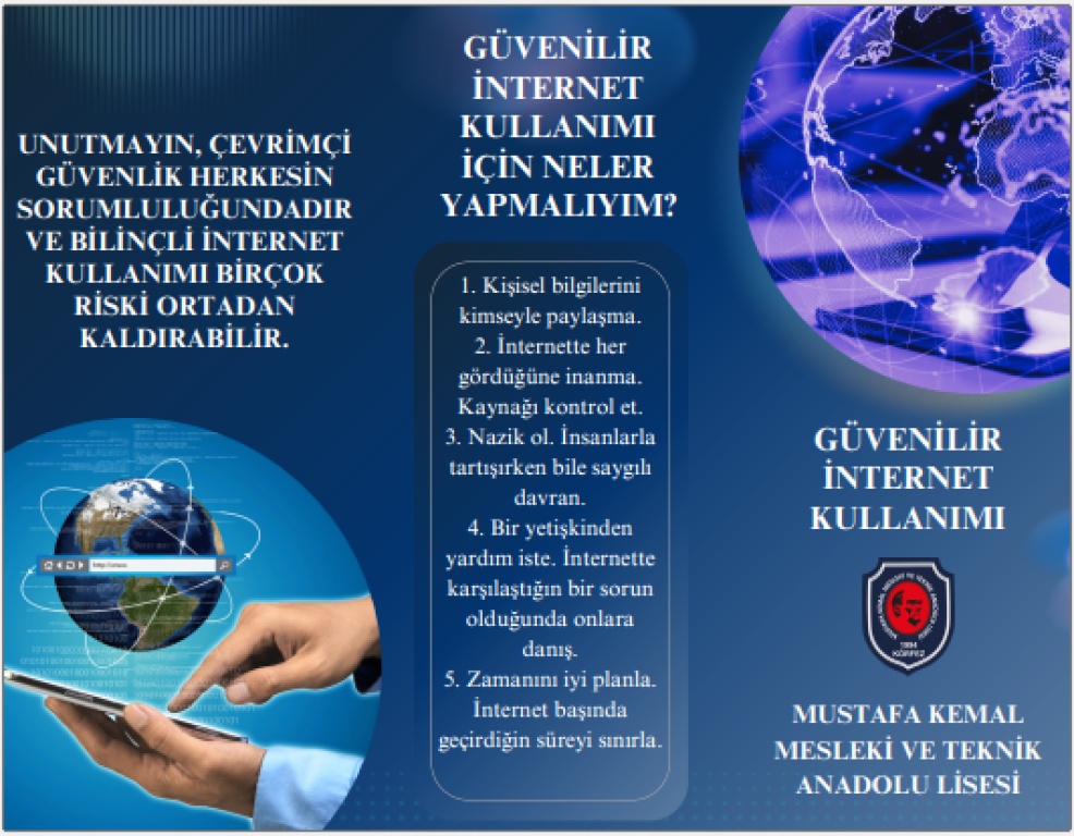 Mesleki eğitimin öneminin anlaşılması ve ahilik anlayışının fark edilmesi adına yürütülen "Ben Her Yerde Varım" Projesi kapsamında şubat ayında güvenli internet temalı okulumuzda bilgilendirme panoları hazırlandı. Büro Yönetimi ve Yönetici Asistanlığı bölümü öğrencilerimiz konuyla ilgili bir broşür hazırlayarak velilerimize dağıttılar.